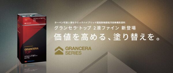 「グランセラ トップ 2液ファイン」は、ラジカル制御技術とセラミックハイブリッド技術を融合させた2液弱溶剤形の無機系塗料です。フッ素樹脂塗料を超える高耐候性・超低汚染性を誇り、コンクリート・モルタル・窯業系サイディング・金属面など幅広い素材に対応しています。