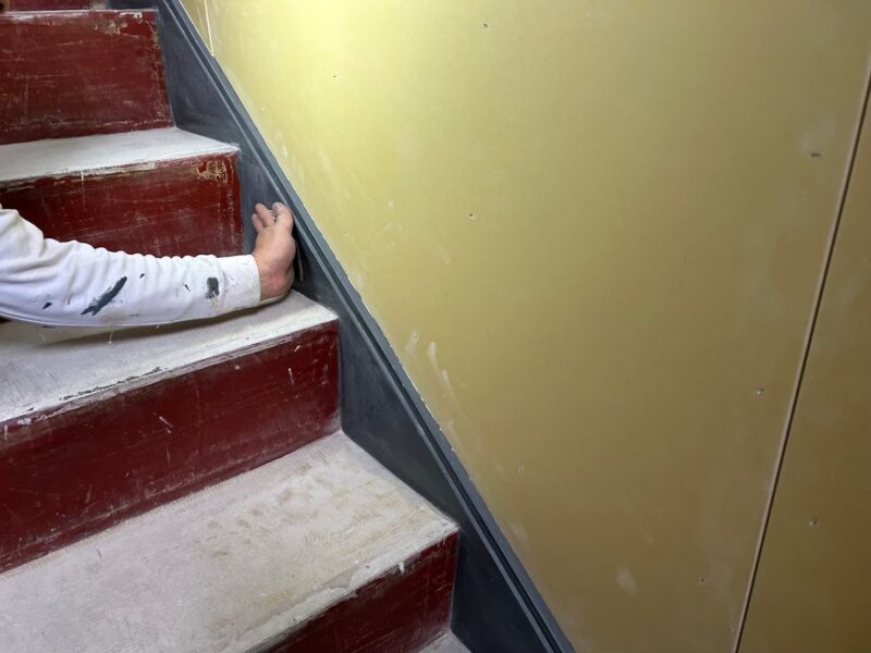 新築工事に伴い、屋内の鉄骨階段のササラと天板の部分塗装を承りました。