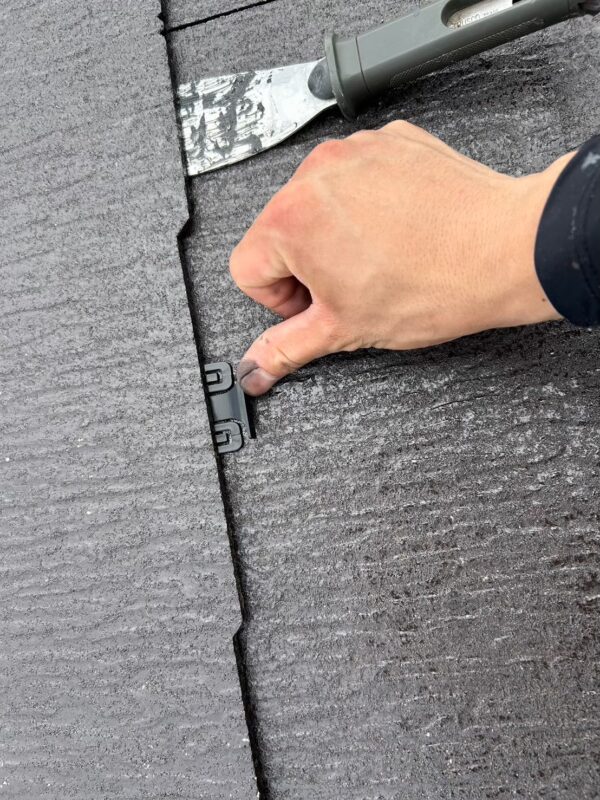 次の塗装に移る前に、屋根材の重なり部分にタスペーサーという器具を挿入し、隙間を確保します。