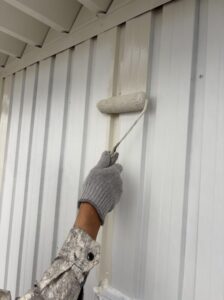 まずは、塗膜にムラの起こらないように吹き付けにて施工していき、美しく塗り付けられるところはローラーも用います。